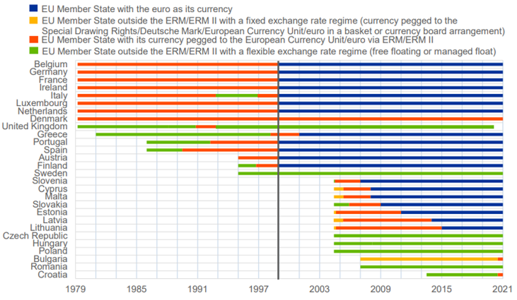 It may be interesting to note that even though it seems logical for EU member countries to peg their currency to the euro before adopting it (perhaps as a way to prove currency stability), some countries maintain their own currency at a fixed rate, and some even at a floating rate: