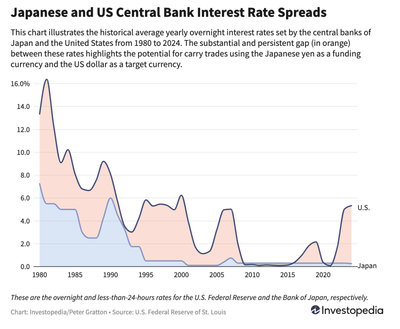 One key factor in the market turbulence was the investment strategy known as the "carry trade," as highlighted by multiple reports. In a carry trade, investors borrow money at low interest rates to invest in assets with potentially higher returns. This strategy is particularly common in foreign exchange (FX) markets, where investors borrow in a low-interest-rate currency and invest in higher-yielding assets denominated in another currency, profiting from the interest rate differential.