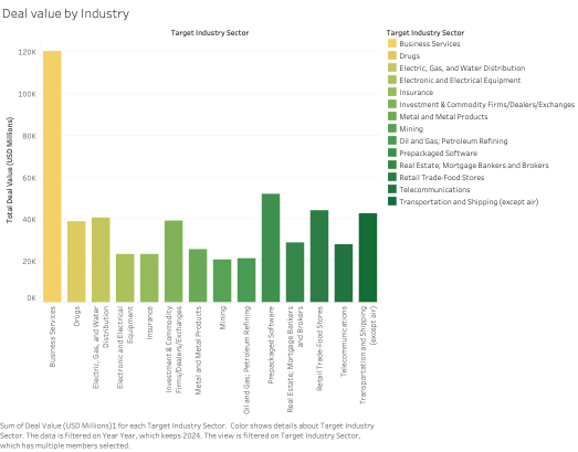 Throughout the first ten months of 2024, the highest levels of M&A activity were observed in the USA and the UK with deal values totaling roughly 185 billion and 77 billion respectively. While this year’s downtrend in deal volume is clear, some countries have fared better than others. For example, the UK experienced an increase of 32% in deal values compared to the first ten months of 2023.Additionally, there are some signs of a potential recovery. According to BCG, M&A sentiment remains low, but has increased since last year and is currently accelerating. Their Global Market Sentiment and Momentum Index is an indicator of the potential willingness of dealmakers to indulge in mergers and acquisitions in the next six months. The index is calculated using valuation levels, interest rates and business activity, among other measures. Currently, the index stands with a low score of 88, with a value of 100 impliying that M&A activity is set to mirror the 10-year historical average.A value of 88 indicates that the sentiment is somewhat accelerating, but the M&A activity is still set to remain below average over the upcoming 6 months. The following section investigates the industries where the deal value contributed significantly to the overall activity in 2024.
