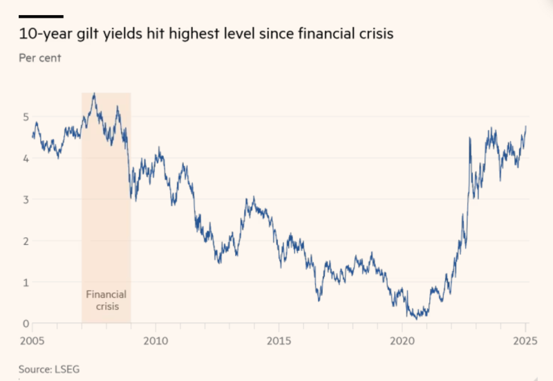 Earlier in January 2025, the UK’s 10-year gilt yield reached its highest level since 2008, signaling soaring borrowing costs for the government. This surge was driven by: