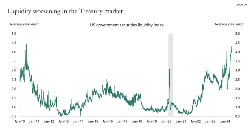 The following graph (Figure 5) shows measures of liquidity in Treasury markets from 2010 to 2024.