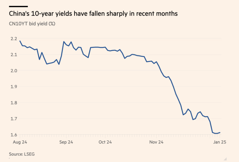 In contrast, China’s 10-year bond yields fell to a record low of 1.6% in January 2025. This move was largely attributed to deflationary expectations and pessimism about future growth.