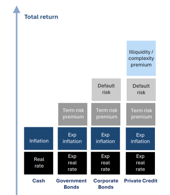 The composition of these components varies across bond types, including government bonds, corporate bonds and private credit, explaining differences in their yields-to-maturity. Figure 1 below illustrates how these components differ.