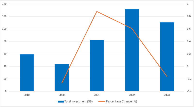 Figure 1: Green Bond Yearly Investment and Percentage Increase Issuance in China from 2019 to 2023